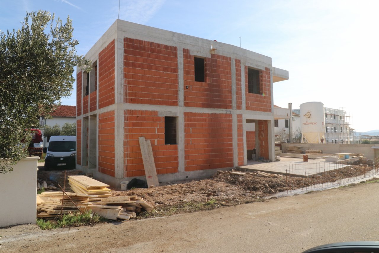 Vodice – Doppelhaushälfte moderner Architektur in ruhiger Lage mit Pool. Das Haus erstreckt sich über zwei Etagen (Erdgeschoss + 1. Stock) und hat eine gesamte Nutzfläche von 101,50 m². Es verfügt über eine große Terrasse / Sonnendeck, einen Außenpool 18m2 und einen großzügigen Parkplatz für zwei Fahrzeuge. Im Erdgeschoss befinden sich ein Eingangsbereich, ein Gäste-WC sowie ein offener Wohnbereich mit Küche und Esszimmer, mit Zugang zur Terrasse. Im Obergeschoss befinden sich zwei Schlafzimmer, Badezimmer, Arbeitszimmer und Terrasse. Das Haus ist hochwertig ausgestattet: Sicherheitstür, Aluminium-Fenster mit Insektenschutzgittern und Fensterläden, hochwertige Keramikbeläge, Fußbodenheizung im Wohnzimmer und in den Badezimmern. Das Grundstück ist vollständig eingezäunt. Die Entfernung zum Strand Vruje beträgt 850 m, ins Stadtzentrum 650 m.