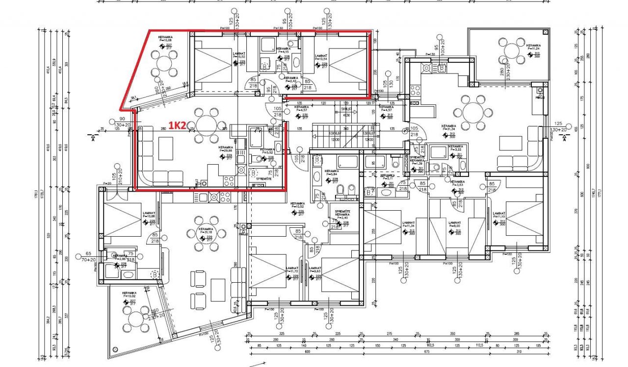 Die Wohneinheit 1K2 befindet sich im ersten Stock des Gebäudes, ist nach Südwesten ausgerichtet und verfügt über eine Nutzfläche von 78,70 m². Im vorderen Teil der Wohnung befindet sich eine großzügige Küche mit Essbereich und Wohnzimmer, mit Zugang zu einer Terrasse von 10,02 m², die Meerblick bietet, zwei Schlafzimmer, zwei Badezimmer und Abstellräume. Zur Wohnung gehört außerdem ein Stellplatz.