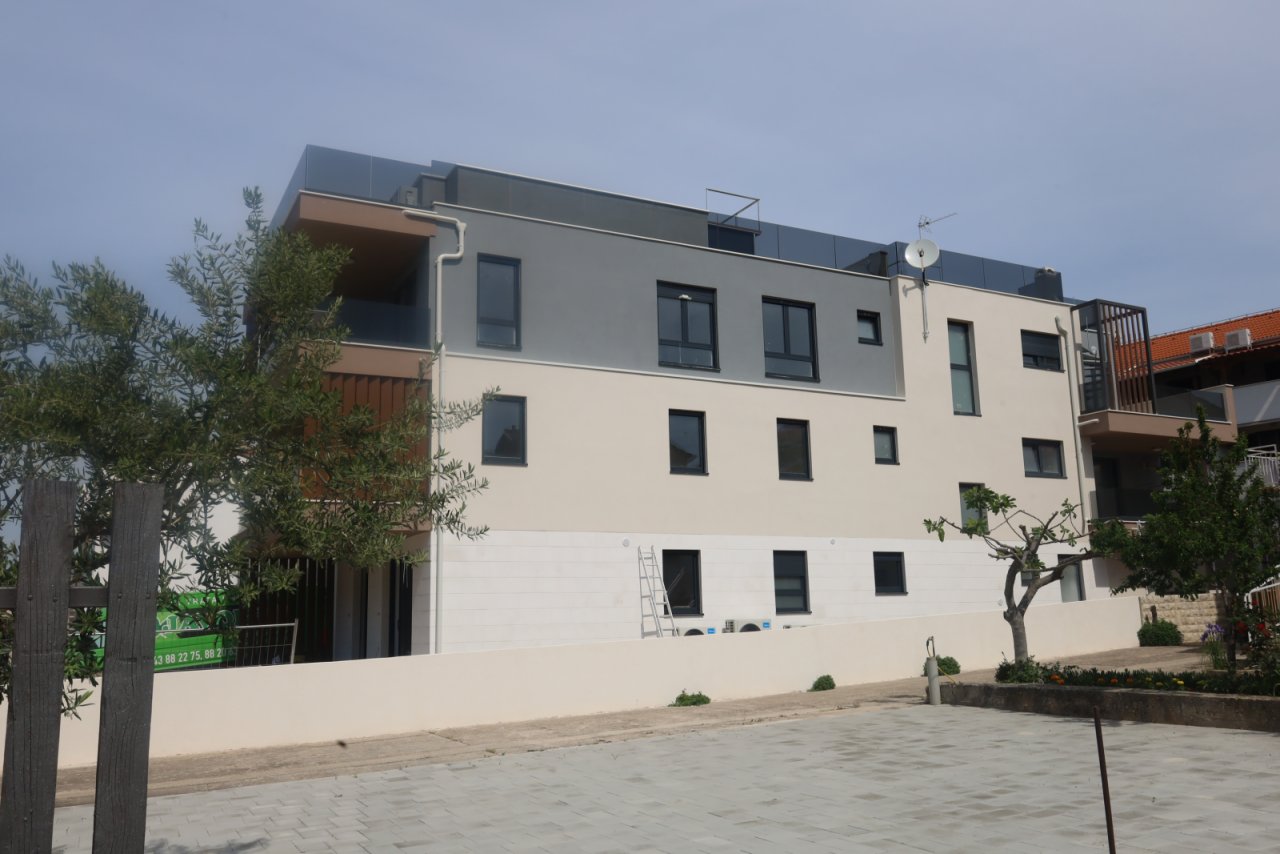 Vodice, in der Nähe des Hangar-Strandes, ist ein neu erbautes Luxuswohngebäude im Rohbaustadium mit 12 Wohneinheiten. Das Gebäude verfügt über insgesamt drei Etagen: Erdgeschoss, 1. und 2. Stock. Das Gebäude ist modern eingerichtet und verfügt über Fußbodenheizung in den Bädern und im Wohnzimmer, hochwertige Böden und Innenausstattung, Klimaanlage in jedem Zimmer und elektrische Rollläden. Der voraussichtliche Einzugstermin ist der 01.07.2026. Der Käufer zahlt beim Kauf keine Grundsteuer.
