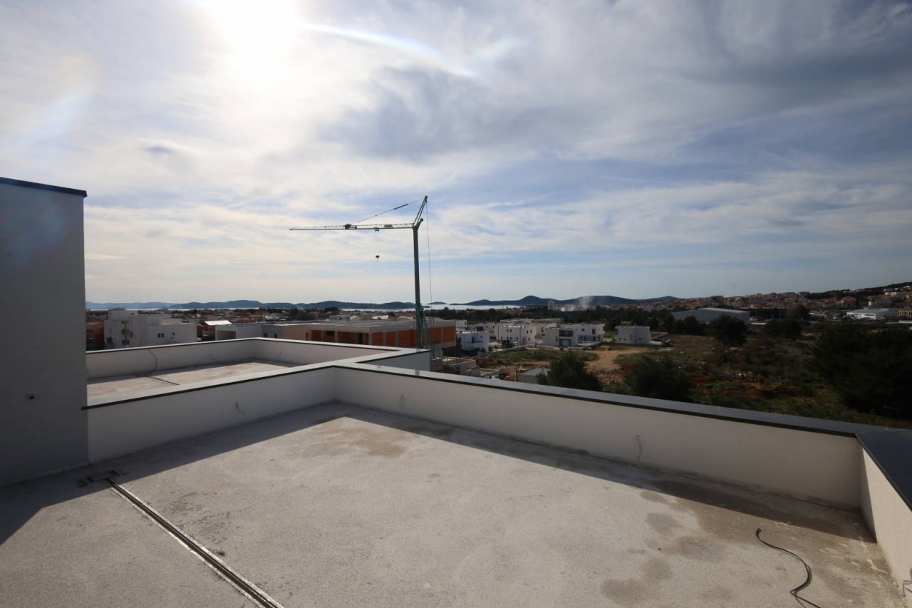 Neu erbaut, in ruhiger Lage, befindet sich eine komfortable Zweizimmerwohnung mit Dachterrasse und Meerblick sowie Parkplatz. Die Wohnung ist Teil eines kleineren Wohnhauses mit insgesamt 4 Wohnungen. Es verfügt über ein modernes Design und eine funktionale Raumaufteilung mit insgesamt 110,31 m2 Nutzfläche und besteht aus zwei Schlafzimmern, einem Badezimmer, einem Flur und einer geräumigen Küche mit Essbereich und Wohnzimmer als Ganzes, die auf eine überdachte Terrasse von 12,25 m2 führt. Eine Innentreppe führt in den 2. Stock, wo sich eine 52,35 m² große Dachterrasse und eine Sommerküche mit Toilette befinden. Die Wohnung ist mit Klimaanlage (Schlafzimmer und Wohnzimmer), Fußbodenheizung mit Warmwasser in der gesamten Wohnung, einem „Valiant“-Elektroherd, PVC-Fenstern mit Moskitonetzen, einer Sicherheitseingangstür sowie hochwertiger Keramik und Sanitärkeramik ausgestattet. Zur Wohnung gehört ein 12,50m2 großer Stellplatz. Die Wohnung liegt 2000 m vom Strand und 1600 m vom Zentrum entfernt.