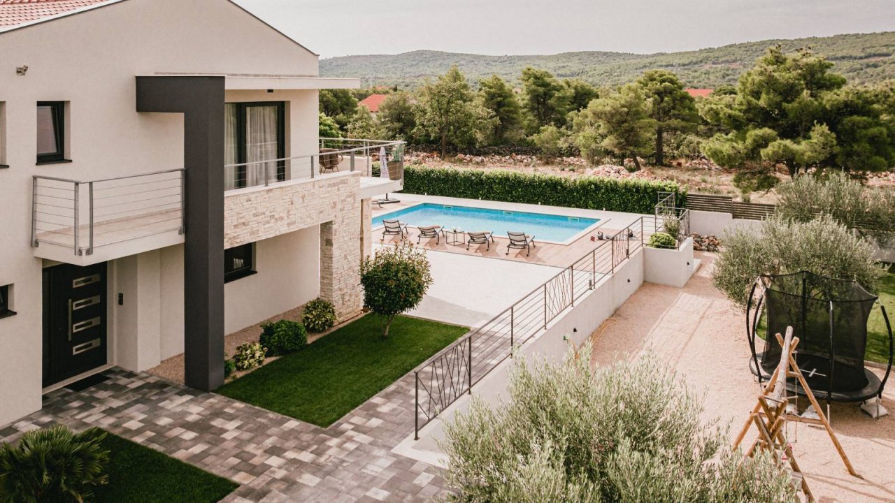 In einer ruhigen Umgebung in Dubrava bei Šibenik befindet sich eine Villa mit moderner Architektur und funktionalem Grundriss mit Swimmingpool und Garage mit einer Gesamtnutzfläche von 266,13 m2, gebaut auf einem Grundstück von 1.831 m2. Sie besteht aus einer geräumigen Küche und einem Esszimmer und einem geräumigen Wohnzimmer mit Zugang zur Terrasse, Toilette, Schlafzimmern, Sauna, Badezimmer, Maschinenraum, Garage und Treppe in den ersten Stock, wo sich die Halle befindet. 3 Schlafzimmer haben jeweils eine eigene Terrasse, 2 davon haben ein eigenes Badezimmer und 1 zusätzliches separates Badezimmer. Das Haus ist voll möbliert, ausgestattet mit Fußbodenheizung in allen Zimmern mit separater Temperaturregelung über eine Wärmepumpe, Klimaanlage in jedem Zimmer, Videoüberwachung, Sonnenkollektoren, automatischer unterirdischer Bewässerung der Umgebung, der Hof ist komplett eingezäunt und bietet auch viel Privatsphäre, innerhalb der Terrasse gibt es eine Sonnenliegefläche und einen Swimmingpool von 50 m2 (5,2 m x 9,6 m), einen Außengrill und eine Mini-Außenküche, einen Basketballplatz. Das Zentrum von Šibenik ist 4 km und der Strand 6 km entfernt.