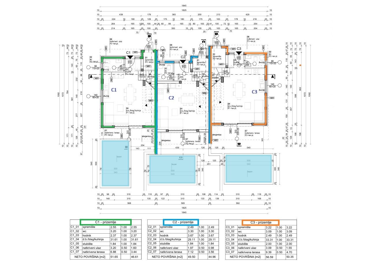Vodice – Doppelhaushälfte moderner Architektur in ruhiger Lage mit Pool. Das Haus erstreckt sich über zwei Etagen (Erdgeschoss + 1. Stock) und hat eine gesamte Nutzfläche von 103,42 m². Es verfügt über eine große Terrasse / Sonnendeck, einen Außenpool und einen großzügigen Parkplatz für bis zu drei Fahrzeuge. Im Erdgeschoss befinden sich ein Außenabstellraum, ein Eingangsbereich, ein Gäste-WC sowie ein offener Wohnbereich mit Küche und Esszimmer, mit Zugang zur Terrasse. Im Obergeschoss befinden sich drei Schlafzimmer und zwei Badezimmer.