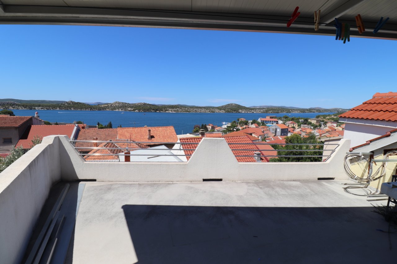 Šibenik, Maisonette-Wohnung mit Meerblick und einer gesamten Nutzfläche von 117,46 m². Sie ist effektiv in zwei separate Einheiten unterteilt: eine bezugsfertige Zweizimmerwohnung mit einer Nutzfläche von 84,29 m² und einer Terrasse von 22,99 m² mit wunderschönem Meerblick sowie eine Einzimmerwohnung mit 30,83 m² im Rohbauzustand, die noch nicht bewohnbar ist.