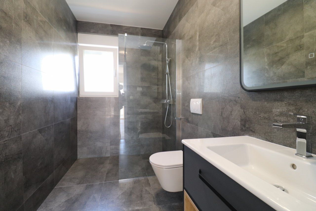 Vodice – Modernes, neu gebautes Familienhaus – sofort bezugsbereit! Das Familienhaus ist vollständig fertiggestellt und bezugsfertig. Es handelt sich um eine Doppelhauseshälfte, hat zwei Etagen – Erdgeschoss und Obergeschoss mit einer gesamten Nutzfläche von 162 m². Die Immobilie besticht durch hochwertige Bauweise, modernes Design und einen durchdachten Grundriss, ideal für das Familienleben. Zum Haus gehören auch ein gepflegter grüner Garten mit 105 m² sowie ein großer Parkplatz für drei Fahrzeuge. Das Erdgeschoss besteht aus einem Eingangsbereich, einem Gäste-WC, einem Abstellraum sowie einem geräumigen, offen gestalteten Wohnbereich mit Küche und Esszimmer, mit Ausgang zur überdachten Terrasse von 38,66 m² – perfekt zum Entspannen und Genießen. Eine Innen¬treppe führt ins Obergeschoss, wo sich ein Flur und drei komfortable Schlafzimmer befinden. Das Hauptschlafzimmer verfügt über ein eigenes Badezimmer und Zugang zur teilweise überdachten Terrasse (7,68 m²), während sich die anderen beiden Schlafzimmer ein zusätzliches Badezimmer teilen. Das Haus ist hochwertig ausgestattet mit: Sicherheitstür. PVC-Fenstern mit elektrischen Rollläden und Insektenschutz. Hochwertigen Keramikböden. Fußbodenheizung in allen Bädern und im Wohnzimmer. Klimaanlagen im Wohnzimmer und in allen Schlafzimmern. Vorinstallationen für Telefon, Internet und Satellitenfernsehen. Die Entfernung zum Stadtzentrum von Vodice beträgt nur 900 m, zur gepflegten Strandpromenade lediglich 1.300 m.