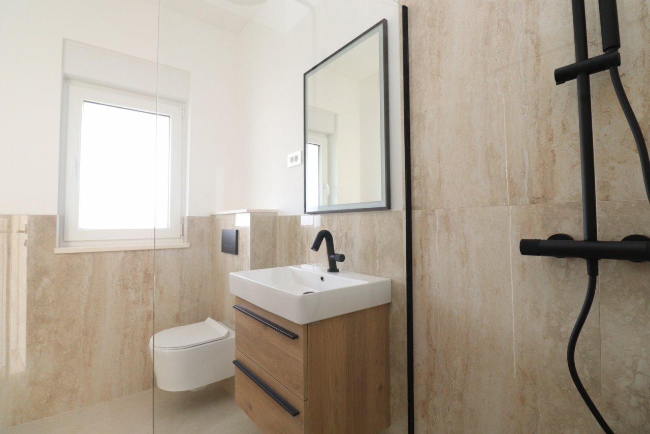 Doppelhaushälfte mit moderner Architektur in ruhiger Lage. Das Haus verfügt über zwei Etagen (Erdgeschoss + 1. Stock) mit einer Gesamtnutzfläche von 115,08 m². Es umfasst eine Grünfläche von 76,66 m², eine große Terrasse und zwei Parkplätze.Das Erdgeschoss besteht aus einem Flur, einem Schlafzimmer, einem Badezimmer sowie einem Wohnbereich mit offener Küche und Esszimmer, der Zugang zu einer 11,79 m² großen Terrasse bietet. Eine Innentreppe führt in das Obergeschoss, wo sich eine Waschküche, zwei Schlafzimmer – jeweils mit eigenem Badezimmer – und eine Terrasse befinden. Das Haus ist ausgestattet mit hochwertigen Keramikfliesen, Klimaanlagen in allen Räumen, Glasgeländern sowie Fußbodenheizung im Wohnzimmer und in den Bädern. Die Entfernung zum Strand beträgt nur 70 m, zum Stadtzentrum sind es 450 m.