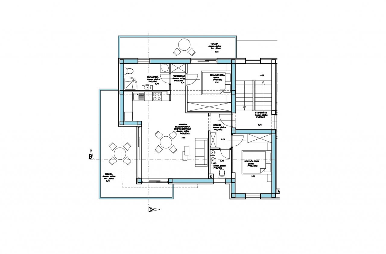 Die Wohnung besteht aus einem Eingangsbereich, einem Gäste-WC, einer Küche, die mit dem Essbereich und dem Wohnzimmer verbunden ist, von dem aus man auf eine große, teilweise überdachte Terrasse von 17,88 m² gelangt. Es gibt zwei Schlafzimmer, eines davon mit eigener Terrasse von 11 m², sowie ein geräumiges Badezimmer.