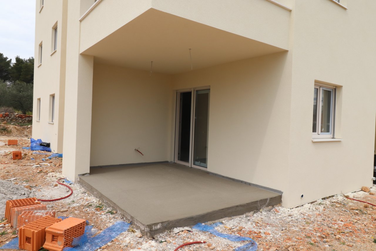 Vodice – Neubau: 2-Zimmer-Wohnung mit einer Gesamtnutzfläche von 88,70 m², gelegen im Erdgeschoss eines Wohngebäudes. Die Wohnung ist nach Osten ausgerichtet und besteht aus einem Flur, zwei Schlafzimmern, einem Badezimmer sowie einem Wohnzimmer mit Essbereich und Küche. Vom Wohnzimmer aus gelangt man auf eine überdachte Terrasse mit einer Fläche von 10,37 m² und in den Garten mit 133,87 m². Die Wohnung ist ausgestattet mit Sicherheitstüren, Klimaanlagen in allen Räumen, elektrischen Rollläden sowie Fußbodenheizung in den Badezimmern und im Wohnzimmer. Ein Außenstellplatz gehört ebenfalls zur Wohnung. Die Entfernung zum Strand beträgt 1.300 Meter, das Stadtzentrum ist 1.000 Meter entfernt.