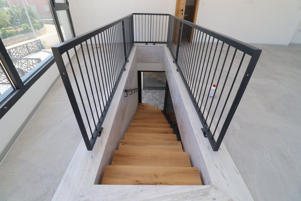 Vodice – Modernes Einfamilienhaus in ruhiger Lage mit Pool und Meerblick. Es handelt sich um eine Doppelhaushälfte mit zwei Etagen (Erdgeschoss + 1. Obergeschoss) und einer gesamten Nutzfläche von 198,90 m². Das Haus verfügt über einen angelegten Garten, eine große Terrasse, einen Außenpool und großzügige Parkmöglichkeiten. Das Erdgeschoss (118,22 m²) besteht aus einer geräumigen Diele, einem Abstell-/Technikraum sowie drei großen Schlafzimmern – jedes mit eigenem Bad und Zugang zur Loggia mit Ausgang in den Garten. Eine Stahltreppe mit Holzstufen führt in das Obergeschoss (80,67 m²), wo sich ein Gäste-WC und ein offener Wohnbereich mit Küche und Esszimmer befinden. Der Wohnraum hat große Glasfronten mit Zugang zur 40,09 m² großen Terrasse, auf der sich ein 25,70 m² großer Pool mit wunderschönem Meerblick befindet. Das Haus ist hochwertig ausgestattet: Sicherheitstüren, Aluminiumfenster mit Moskitonetzen und Fensterläden, hochwertige Keramikböden, Wärmepumpe mit Solaranlage für Warmwasser, Klimaanlagen in allen Räumen sowie Glasgeländer.