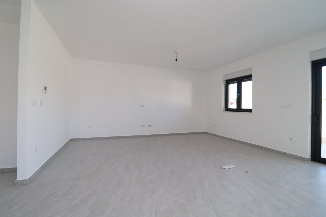 Vodice, neu gebaute zweistöckige Wohnung mit zugehörigem Hof und zwei Parkplätzen. Die Wohnung hat eine Nutzfläche von 172,73 m², befindet sich im Erdgeschoss und im 1. Obergeschoss, liegt in einem Mehrfamilienhaus und ist nach Südosten ausgerichtet.