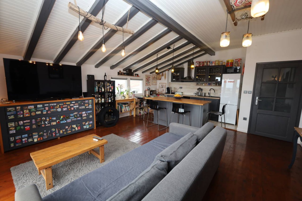 Vodice – in attraktiver und ruhiger Lage steht eine großzügige Dreizimmerwohnung mit einer Gesamtfläche von 116,84 m² zum Verkauf, gelegen im zweiten Stock eines kleineren Wohngebäudes. Die Wohnung verfügt über einen privaten Eingang, der über eine Innentreppe erreichbar ist, welche ausschließlich zu dieser Einheit gehört und zusätzliche Privatsphäre gewährleistet. Sie besteht aus einem Flur, einem geräumigen Wohnbereich mit Küche und Esszimmer mit Zugang zu einer nicht überdachten Terrasse von 29,40 m² mit Meerblick, drei Schlafzimmern sowie einem Badezimmer. Zur Wohnung gehört außerdem ein 79 m² großer, charmant gestalteter Privatgarten mit Wasser- und Stromanschluss sowie einem zusätzlichen WC, sowie ein Außenstellplatz. Die Wohnung ist mit Klimaanlagen zum Heizen und Kühlen sowie PVC-Fenstern. Die Möblierung ist im Kaufpreis inbegriffen. Der gepflegte Strand ist 800 m entfernt, das Stadtzentrum und alle wichtigen Einrichtungen befinden sich nur 600 m entfernt.