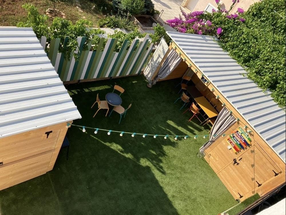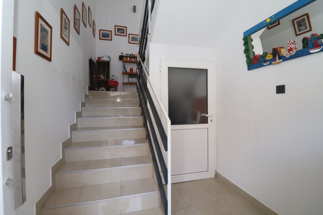 Vodice, city center – Three-bedroom apartment with sea view, large terrace 29.39 m² and courtyard with parking for two vehicles. The apartment is located in the center of Vodice, situated on the top floor – in the high attic of a three-storey house with a total of three residential units. The apartment has a total usable area of 140.89 m². The courtyard of 108 m² is partly paved and provides parking space for two vehicles, as well as a separate enclosed yard area where there is a wooden house used as a summer kitchen, storage room, and workshop. There is also a small toilet in the courtyard. The apartment has its own staircase, leading from the ground floor to the attic level. The apartment itself has a living area of 99.67 m² and consists of an entrance hall, a spacious bathroom with laundry area, three bedrooms, and a large living room with an open kitchen. From the living room there is access to a large terrace of 29.39 m², south-facing, offering a beautiful view of the sea and the town of Vodice. The apartment is equipped with air conditioning and is sold fully furnished, with all furniture included in the property price. The Vruje beach is 850 m away, while the city center is only 300 m away.