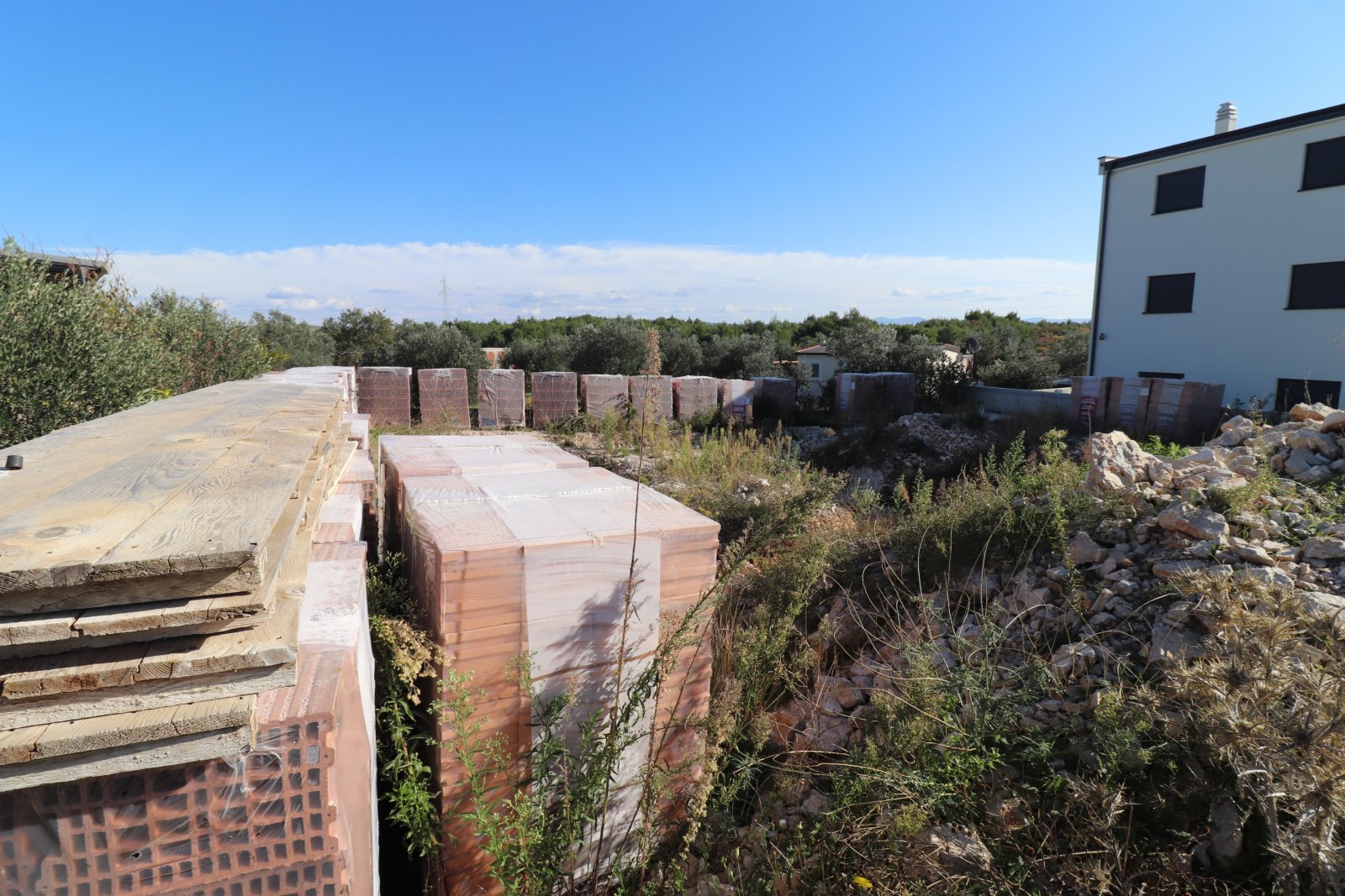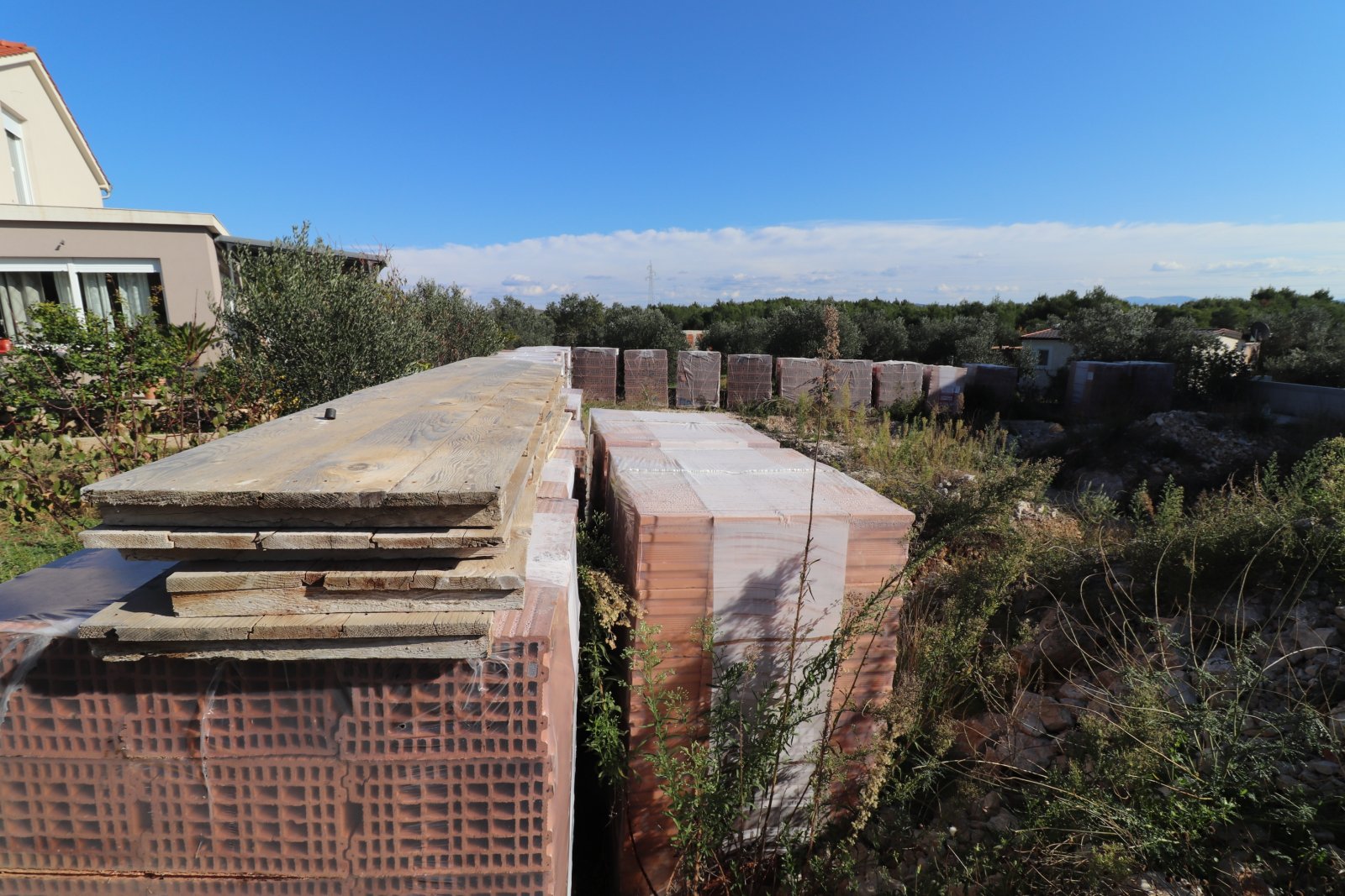Das Grundstück hat eine Fläche von 402 m², mit Abmessungen von 21 m Breite entlang der Zufahrtsstraße × 19 m Länge. Die Zufahrtsstraße ist eine Schotterstraße mit einer Breite von 6 m. Das Grundstück ist eben und nach Südwesten ausgerichtet. Für das Grundstück wurde eine Baugenehmigung für den Bau eines freistehenden Einfamilienhauses mit Erdgeschoss und Dachgeschoss mit zwei Maisonette-Wohneinheiten erteilt. Die geplante Nutzfläche des Gebäudes beträgt 202,88 m². Kommunal- und Wasserbeiträge wurden nicht bezahlt. Auf dem Grundstück haben bereits Bauarbeiten begonnen – die Aushubarbeiten für die Fundamente wurden durchgeführt. Ein Teil des Baumaterials, nämlich Baublöcke, befindet sich bereits auf dem Grundstück. Die Infrastruktur befindet sich direkt am Rand des Grundstücks. Die Entfernung zum Zentrum von Vodice beträgt 1.850 m, zur Strand Vruje 2.200 m.