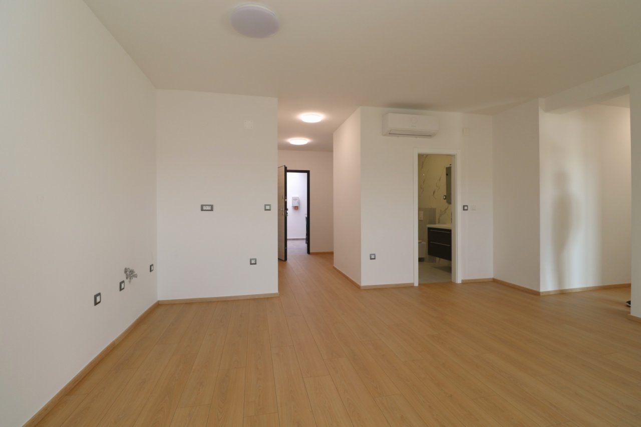 Vodice, Neubau, komfortable 2-Zimmer-Wohnung mit Terrasse und Meerblick, mit einer Nutzfläche von 82,95 m². Sie befindet sich im 1. Stock eines kleineren Wohngebäudes mit 6 Wohneinheiten und ist nach Westen ausgerichtet. Die Wohnung besteht aus einem Eingangsbereich, Flur, Badezimmer, zwei Schlafzimmern sowie einem geräumigen Wohnzimmer mit Küche und Essbereich, von dem aus man auf die Terrasse gelangt. Die überdachte Terrasse mit einer Fläche von 11,50 m² bietet einen Meerblick. Zur Wohnung gehört ein Parkplatz. Sie ist ausgestattet mit Fußbodenheizung im Badezimmer, einer Bosch-Klimaanlage zum Heizen und Kühlen, Aluminiumfenstern mit elektrisch betriebenen Rollläden sowie einer Sicherheitstür. Das Gebäude befindet sich 1.700 Meter vom Strand und 1.300 Meter vom Zentrum sowie allen wichtigen Einrichtungen entfernt.