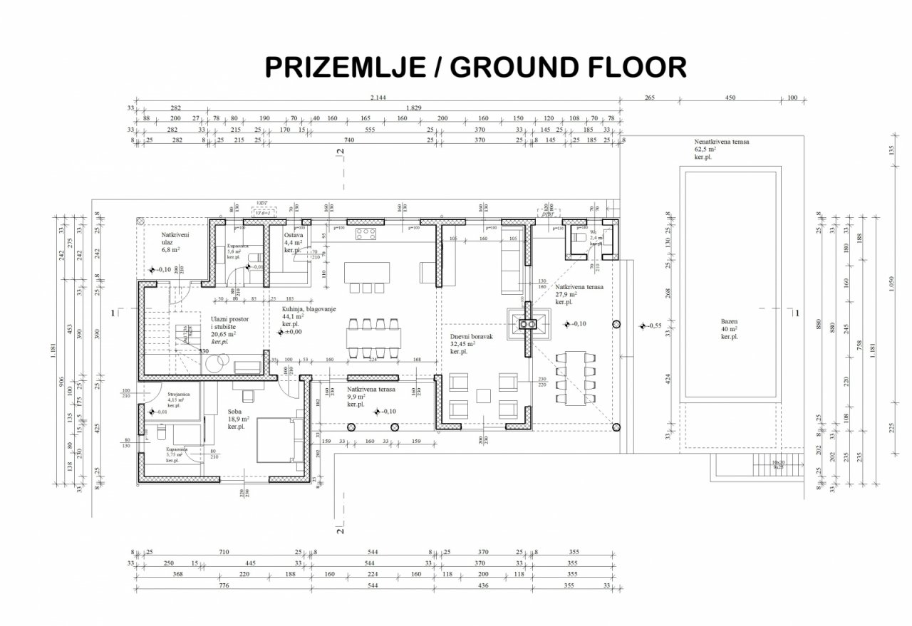 Das Grundstück hat eine Fläche von 789 m², und die Abmessungen betragen 38 m Breite entlang der Zufahrtsstraße × 21 m Länge. Die Zufahrt zum Grundstück ist eine Schotterstraße mit einer Breite von 6 m. Das Grundstück ist eben und nach Süden ausgerichtet. Für das Grundstück wurde eine Baugenehmigung für den Bau eines freistehenden Einfamilienhauses (Erdgeschoss + Obergeschoss) mit Garage, großer Terrasse und einem Pool von 40 m² erteilt. Die zukünftige Nutzfläche des Gebäudes beträgt 282,98 m². Die Kommunalgebühren sind nicht bezahlt. Das Grundstück ist gereinigt, eingeebnet und baubereit, und das Grundstück ist vollständig mit einer hohen Betonmauer umzäunt. Die Infrastruktur befindet sich direkt am Rand des Grundstücks. Die Entfernung zum Zentrum von Vodice beträgt 900 m und zum Strand Vruje 1.120 m.